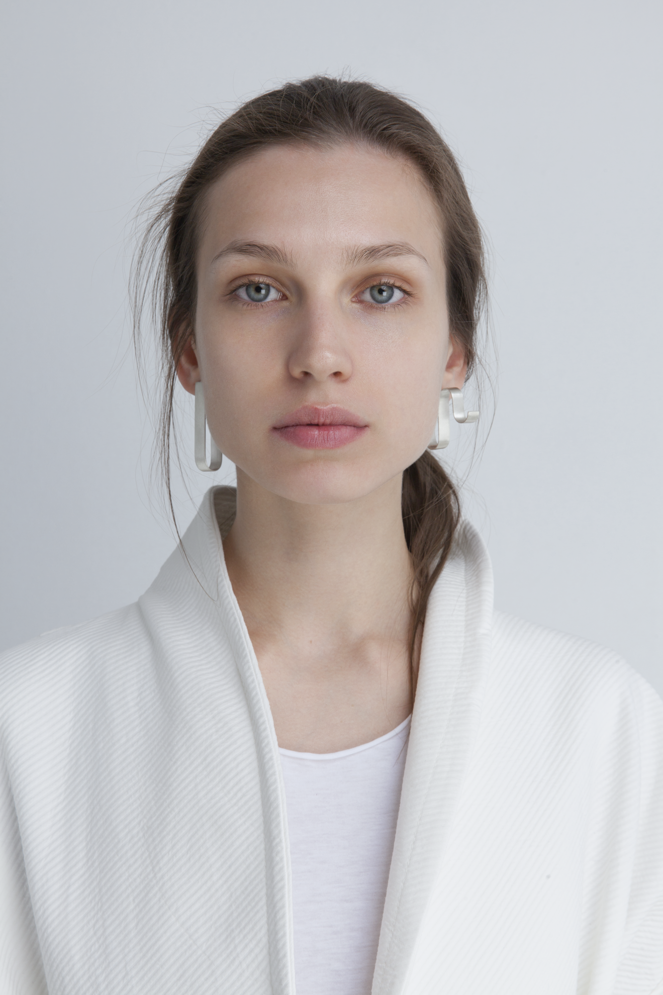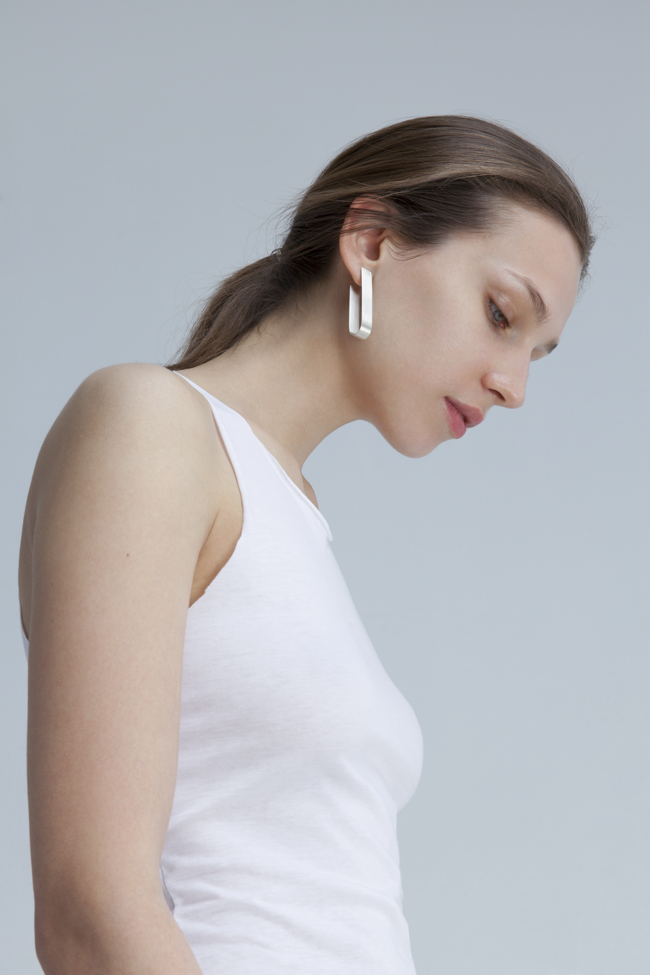 With the earrings, the rigor of the pair comes undone. A single earring makes enough sense, or can be fluently combined with any other earring from Sine series.